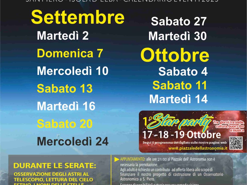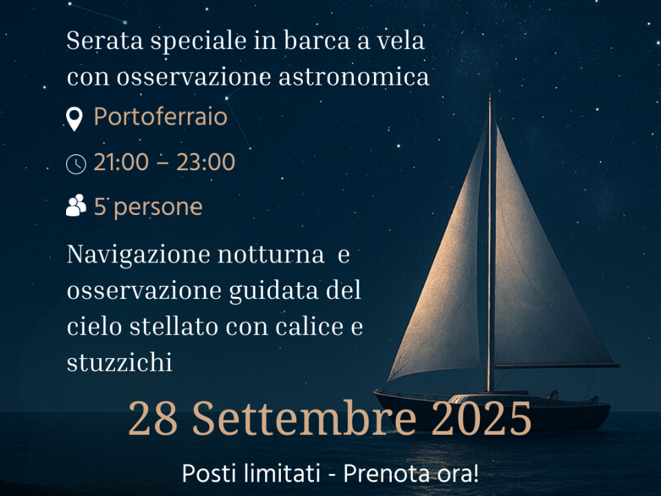 24 Settembre 2025 0✨ Navigando tra le Stelle ✨ Dopo il grande successo della serata del 4 settembre siamo felici di replicare la serata "Navigando fra le stelle"! Immagina di salpare al tramonto, lasciando la costa alle spalle, mentre il mare si fa specchio del cielo. Il silenzio interrotto solo dallo scafo che accarezza l’acqua… e sopra di te, la magia del cielo e della via lattea. Con la guida degli esperti dell’Associazione Astrofili San Piero, potrai vivere un viaggio unico: - una navigazione notturna tra le meraviglie del cielo - un’osservazione guidata delle stelle e delle costellazioni - un brindisi speciale sotto la volta celeste accompagnato da stuzzichini Un’esperienza unica che nasce dalla collaborazione tra il 🌙 Piazzale dell’Astronomia di San Piero https://www.piazzaledellastronomia.it/ 🌍Associazione Gea https://www.yumpu.com/it/document/view/15356755/1-il-curriculum-gea-nasce-nel-1994-a-milano-poi-si-trasferisce- 🚗 Elba Vintage Tour https://elbavintagefashiotour.mystrikingly.com/ ⛵ Vivere in Barca https://asd.vivereinbarca.it 📍 Portoferraio – Isola d’Elba 📅 28 Settembre 🕘 21:00 – 23:00 👥 massimo 5 partecipanti 👉 Posti limitati, prenota subito! 📞Saverio +39 347 224 7610 📞 Marina +39 392 724 4760 📞 Andrea +39 327 980 8672CALENDARIO SETTEMBRE – OTTOBRE 2025