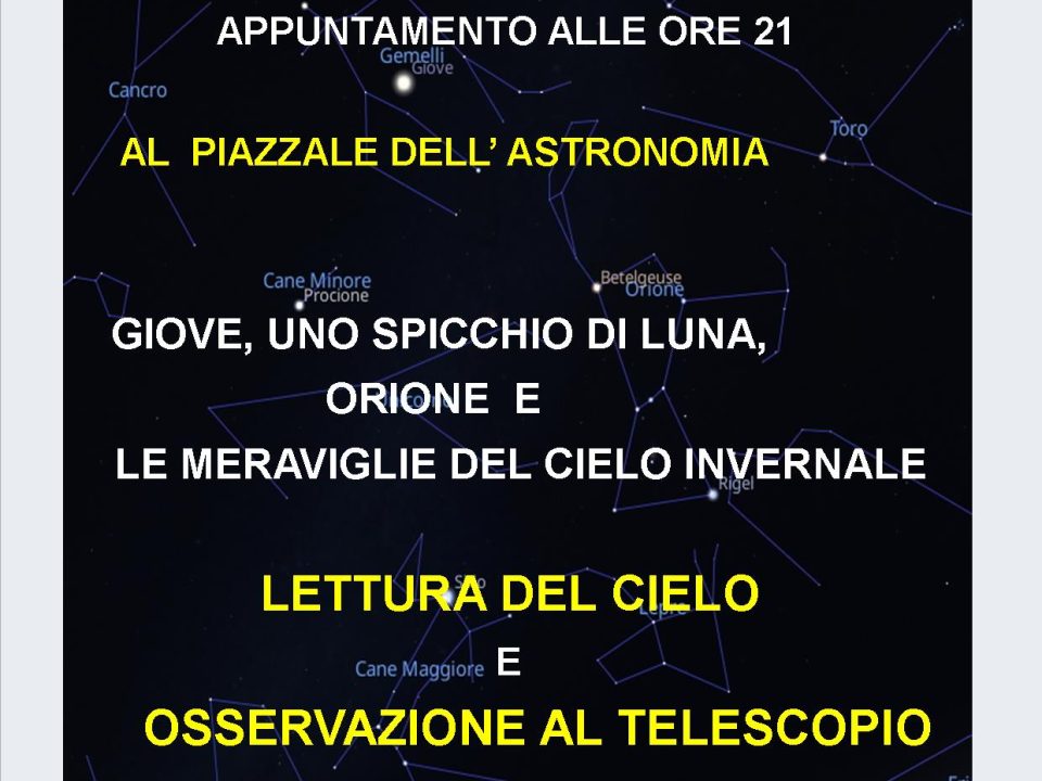 19 Febbraio 2026 0Serata Astronomica , in prima serata uno spicchio di Luna, segue Giove e la Costellazione di Orione con le sue Stelle brillanti e le Nebulose, le Costellazioni invernali. Racconti di Miti e Leggende dei due grandi amatori , i Giganti del Cielo il sommo Zeus ed il formidabile Cacciatore. Durante la serata , osservazione con un Telescopio Professionale . Agli adulti e richiesto all’ ingresso un contributo ad offerta libera, a sostegno del nostro progetto di costruzione del primo Osservatorio Astronomico dell’ Isola d’ Elba.NELL’ AMBITO DI S. Piero il Paese degli Innamorati Serata Astronomica Venerdì 13 Febbraio