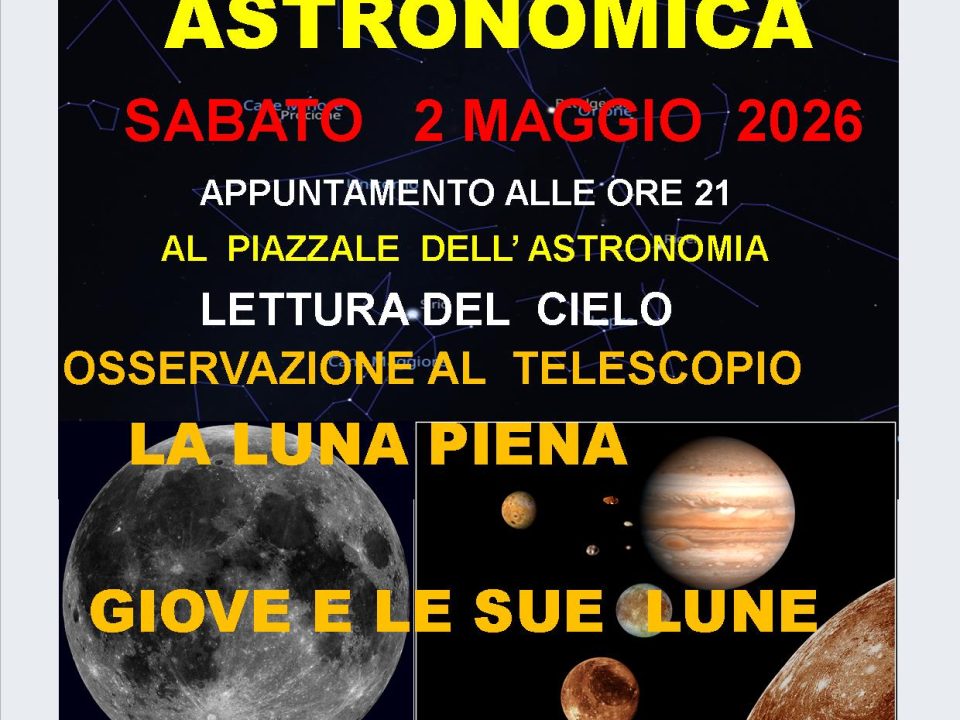 21 Aprile 2026 0Osserveremo la Luna crescente , Giove e i suoi Satelliti ,con un Telescopio Professionale salutiamo le Costellazioni invernali e accogliamo quelle Primaverili . Racconto del cielo con i nomi delle Stelle , le Costellazioni, i Miti, le Leggende e tanto altroSERATA ASTRONOMICA VENERDI 17 APRILE 2026